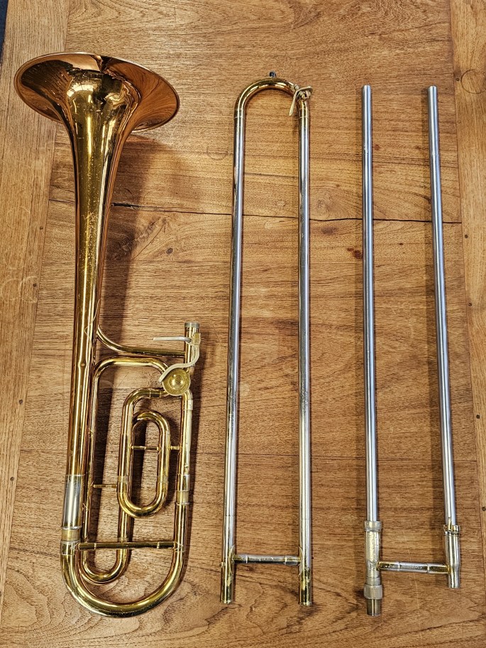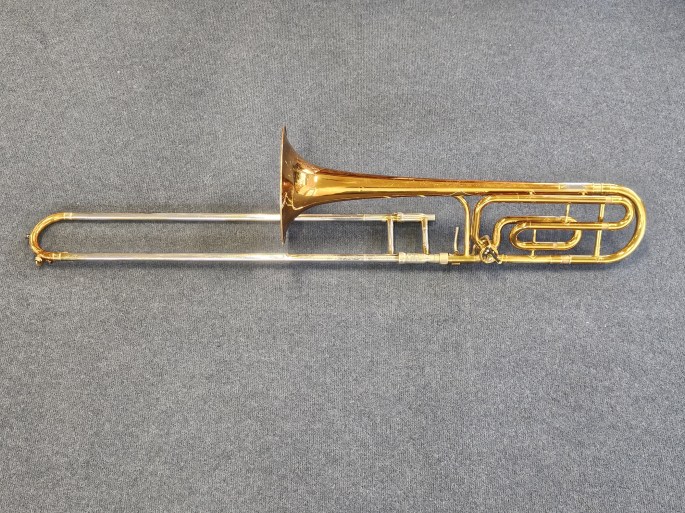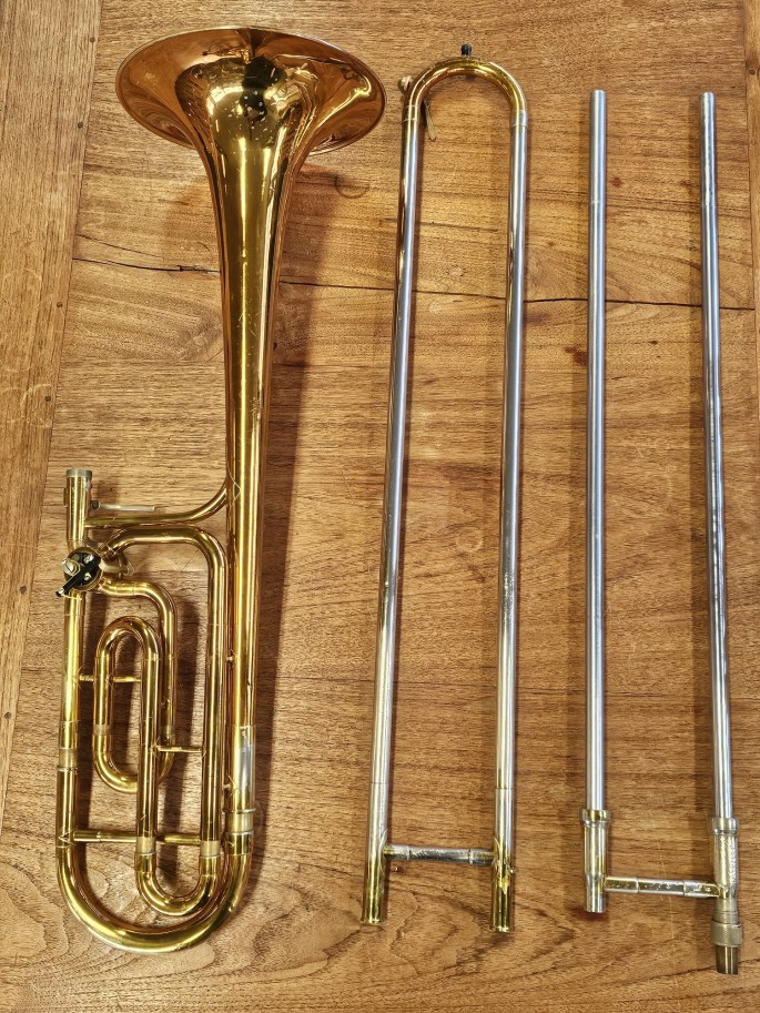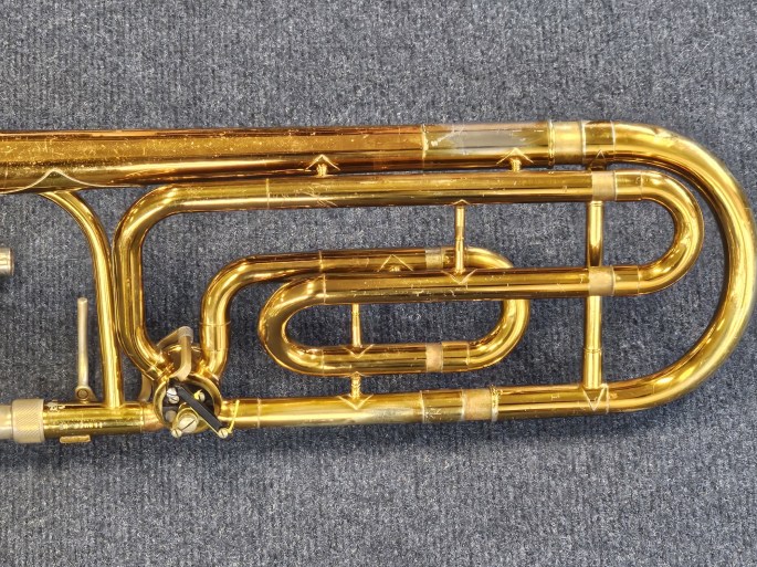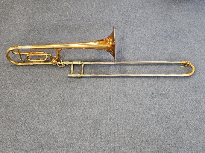 This King 2104 4B tenor trombone in Bb/F is a well-known and respected model, valued for its reliable construction and characteristic King sound. The instrument has been fully serviced and is in good playing condition.