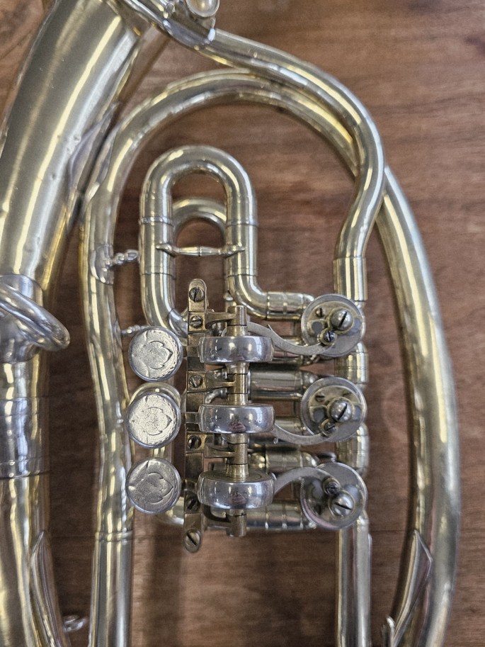 This instrument has been completely overhauled including: chemical cleaning, removing most dents, replacing worn bumpers/corks and polishing by hand.