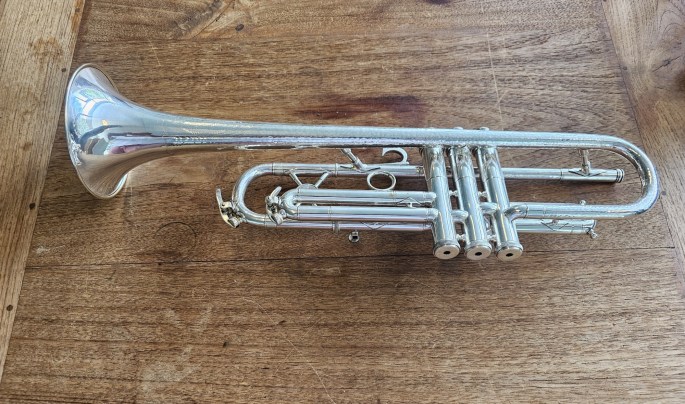 Eine wunderschön handgehämmerte C/B-Trompete, gefertigt von Meister Pscherer aus Klingenthal. Dieses besondere Instrument wurde komplett überprüft und ist in gutem Zustand, mit einem ausdrucksstarken und resonanten Klang.