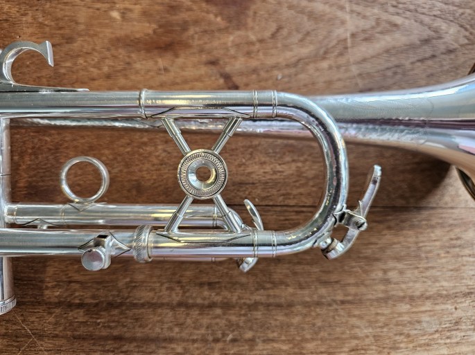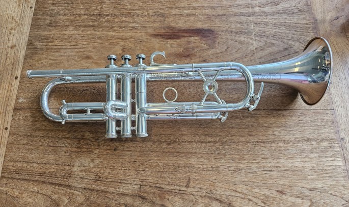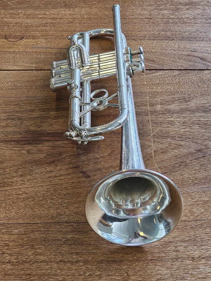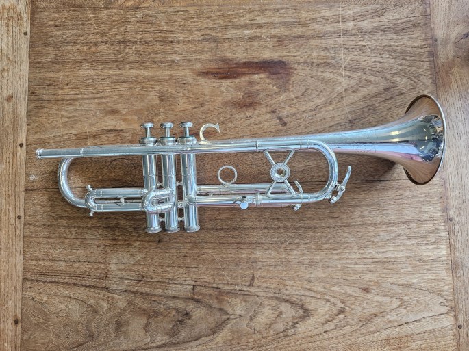 Deze prachtig handgehamerde C/Bes trompet is gemaakt door Meister Pscherer uit Klingenthal, Duitsland. Het instrument is volledig nagekeken en verkeert in goede conditie, met een warme en heldere klank.