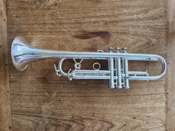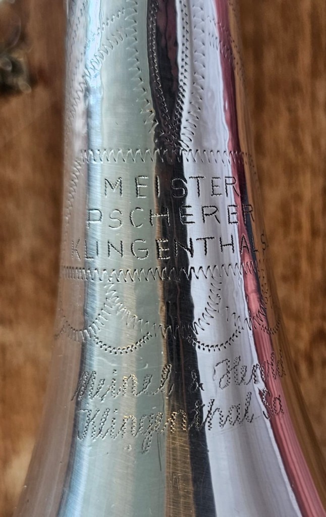A beautifully hand-hammered C/Bb trumpet, crafted by Meister Pscherer from Klingenthal, Germany. This unique instrument has been thoroughly inspected and is in good condition, offering an expressive and resonant tone.