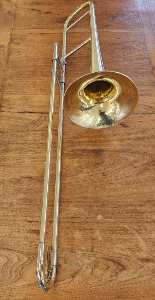 Deze ongelakte trombone heeft een mooie klank en is gemakkelijk te bespelen. Hij is volledig gereviseerd en verkeert in goede staat.