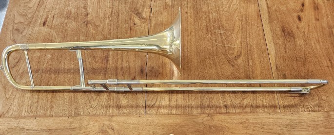 This unlacquered trombone has a beautiful tone and is easy to play. Has been completely overhauled and is in good playing condition.