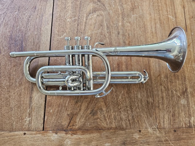 Een fraai gebouwde Bes-cornet, gemaakt door Persy uit Bruxelles. Dit instrument is geheel nagekeken en in goede conditie, en heeft een heldere, mooie klank.