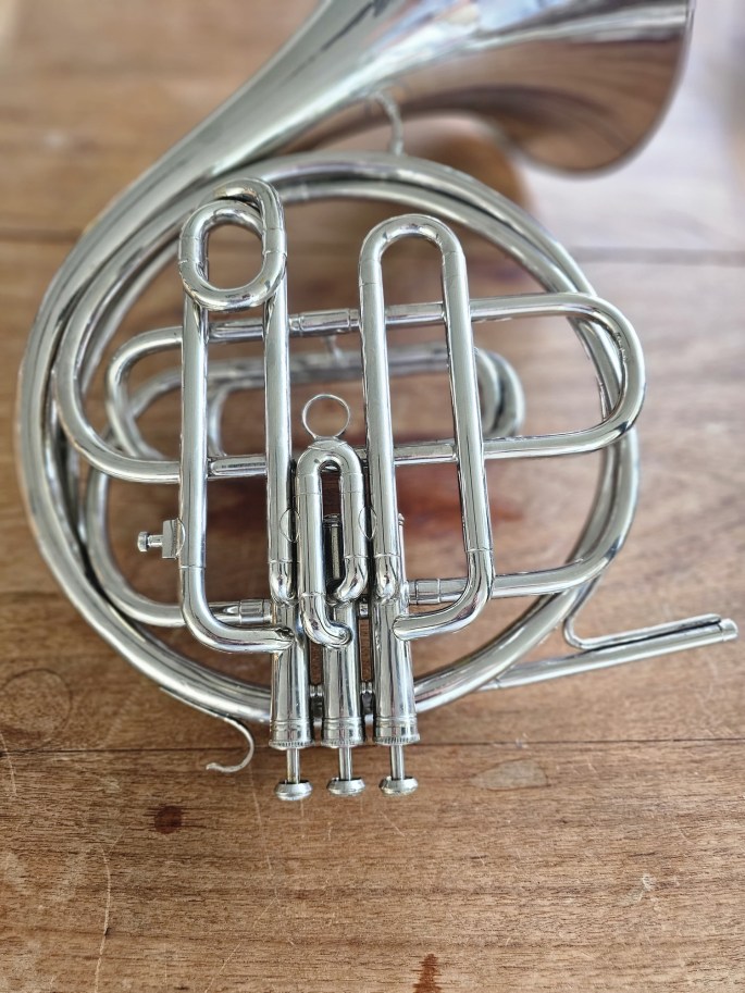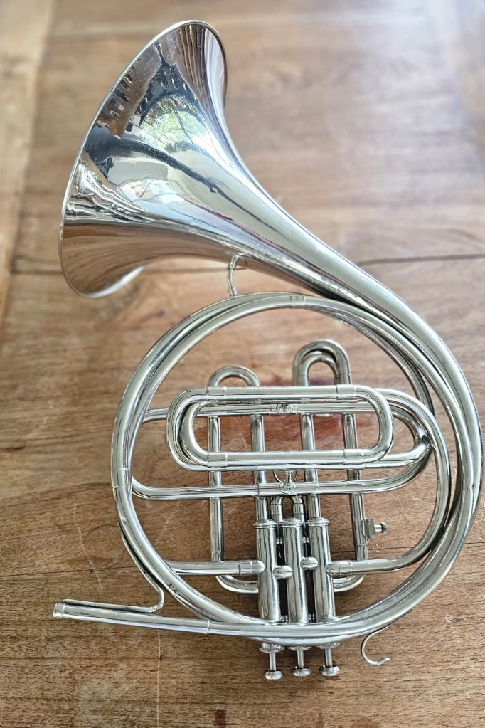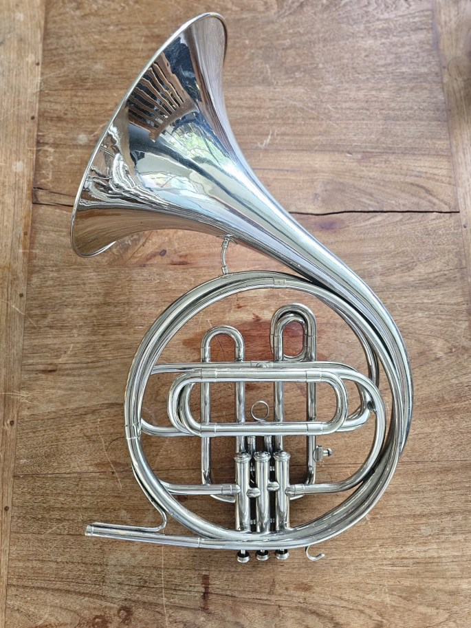 Een zeldzame en mooi gemaakte hoorn in laag Es, gebouwd door Persy uit Brussel. Dit instrument is geheel nagekeken en in goede conditie, met een warme en karaktervolle klank.