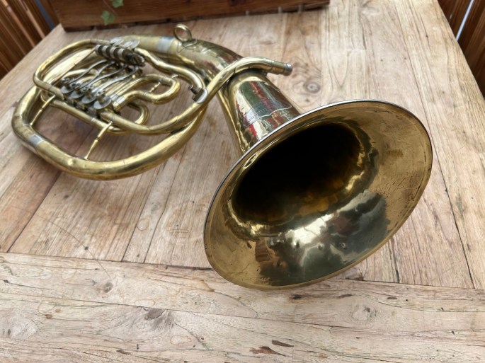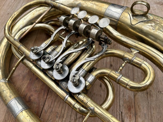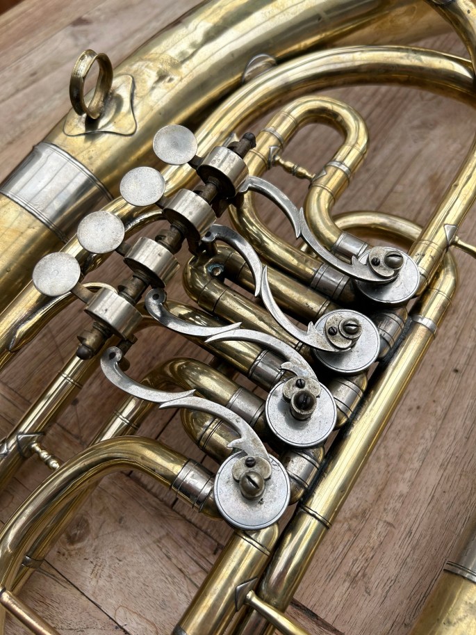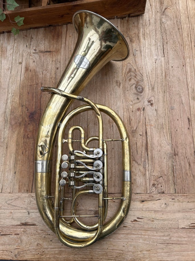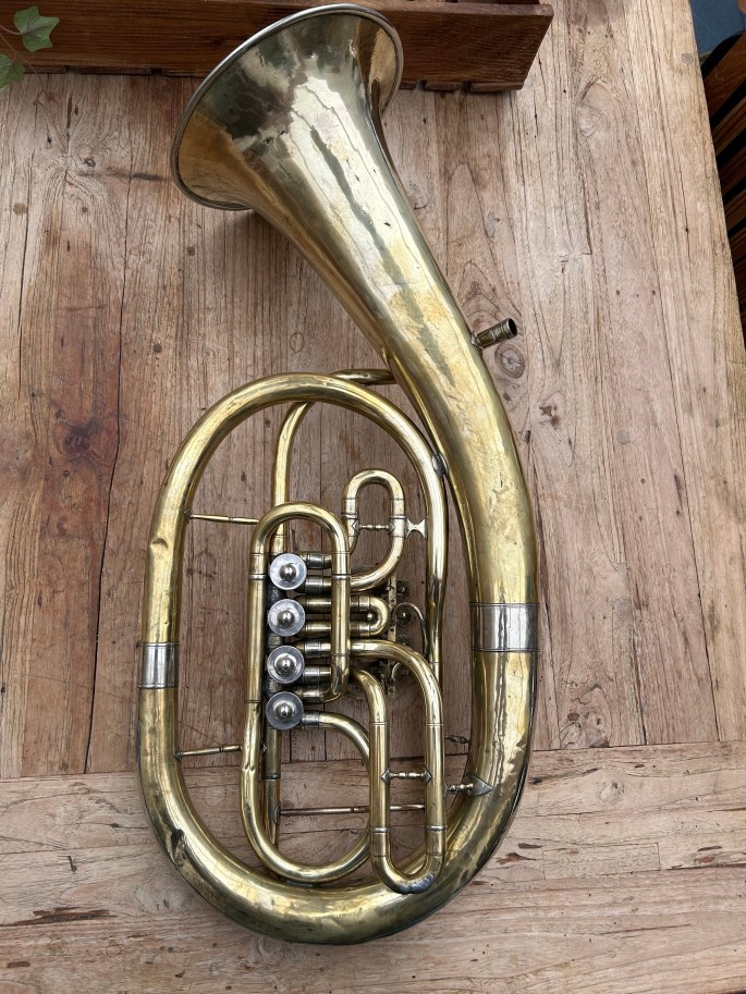 Deze 4-cilinder tenorhoorn is in zeer goede staat. Alle ventielen en schuiven bewegen gemakkelijk en de compressie is goed (gezien zijn leeftijd).