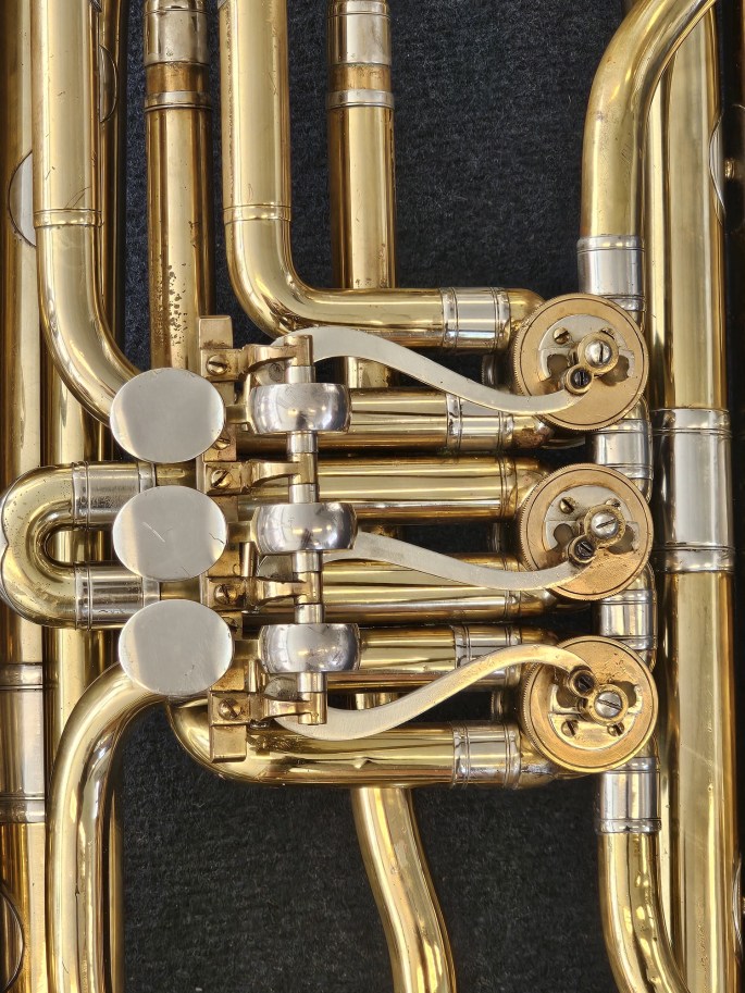 Een hoogwaardige 3/4 Bes bas tuba, gemaakt door Rudolf Meinl, een van de meest gerespecteerde tubabouwers ter wereld. De gravure “Rumedies” staat voor RUdolf MEinl DIESpeck, de plaats van de werkplaats. Dit instrument is geheel nagekeken en in goede conditie.