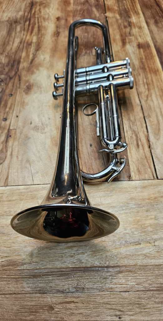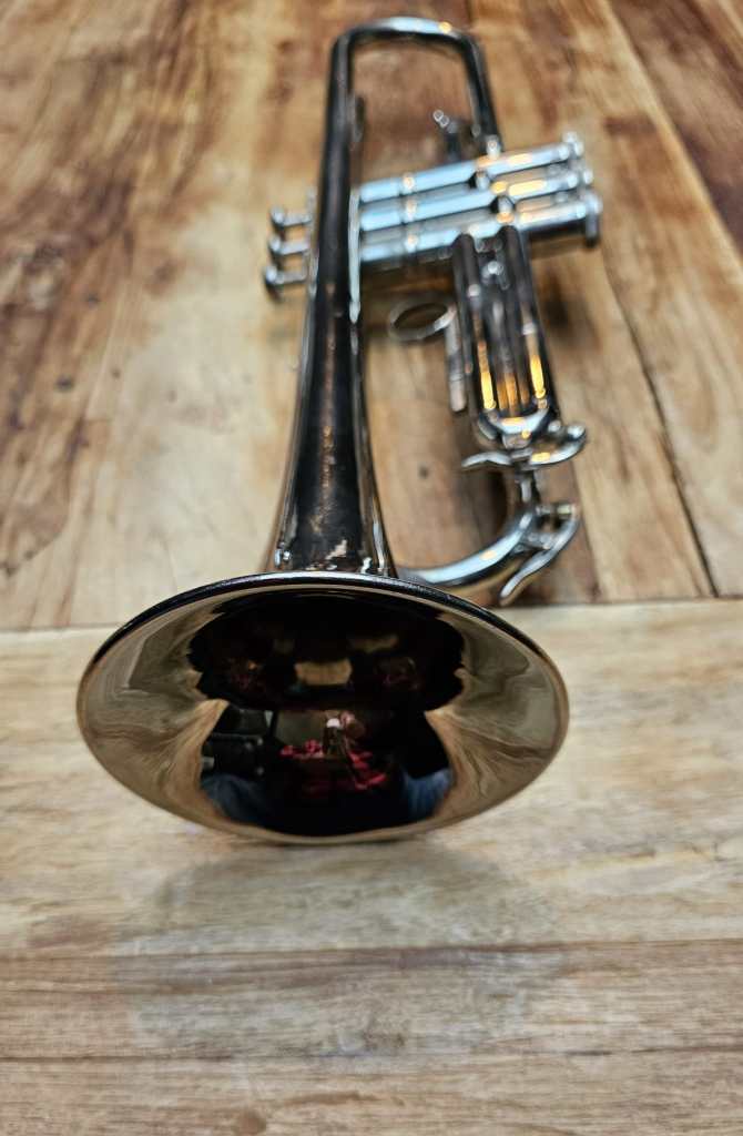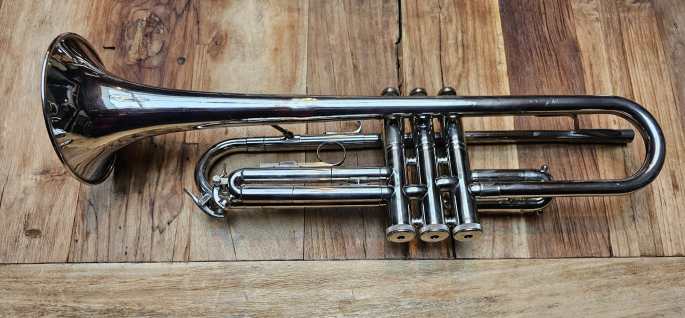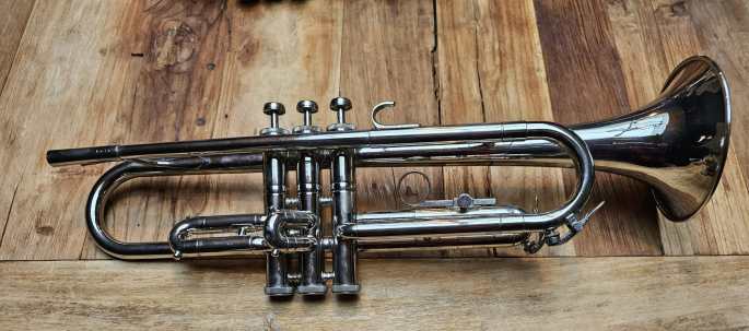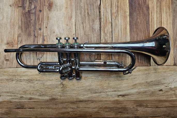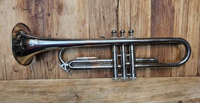 Diese vernickelte Bb Trompete ist in gutem technischen Zustand. Alle Ventile und Züge sind leicht beweglich und die Kompression ist gut.