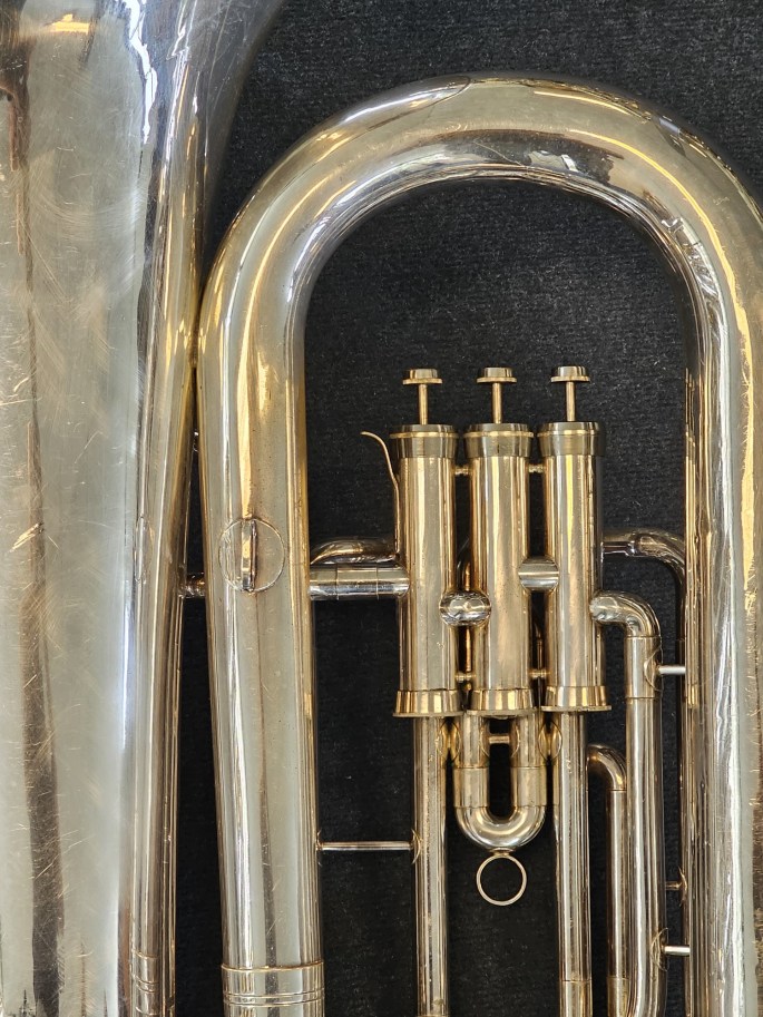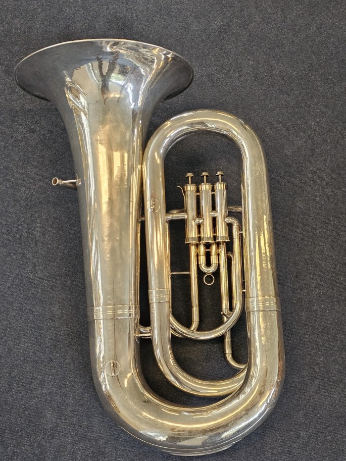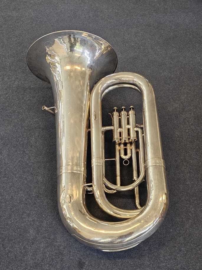 Eine hochwertig gefertigte B-Tuba, gebaut von Schenkelaars, einem angesehenen niederländischen Instrumentenbauer. Dieses Instrument wurde komplett überprüft und ist in gutem Zustand und überzeugt durch einen satten, resonanten Klang.