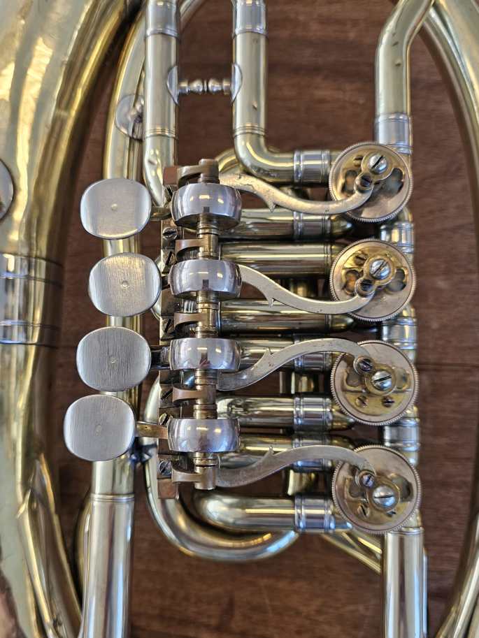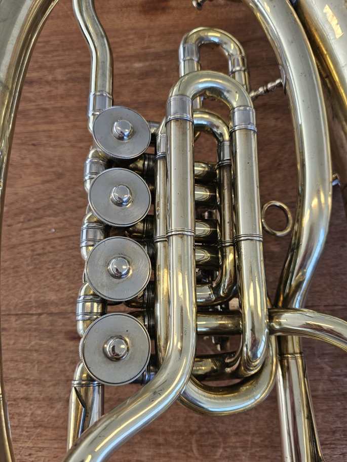 Deze 4-ventiels tenorhoorn is in zeer goede staat. Alle ventielen en schuiven bewegen gemakkelijk en de compressie is goed.