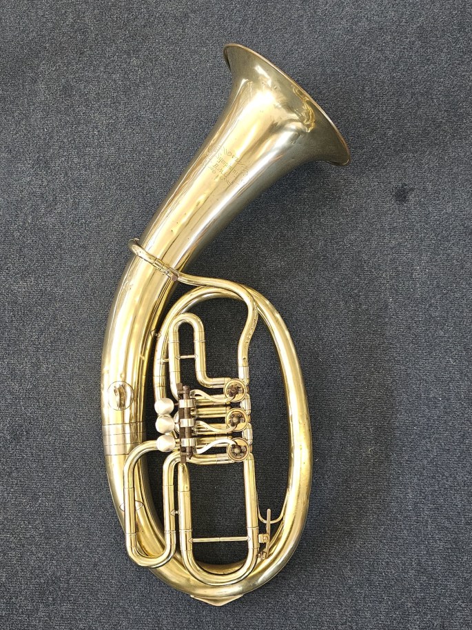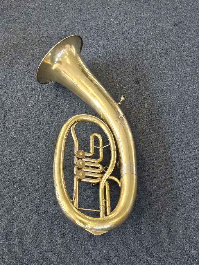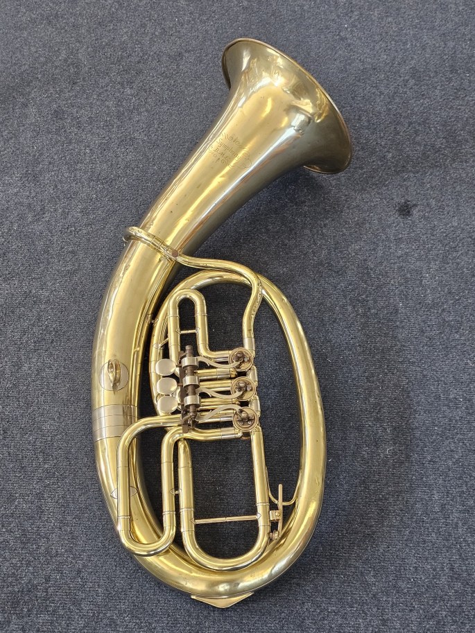 A well-made Bb oval baritone, stamped Symphony B.M.C., manufactured by Amati, a well-known Czech brass instrument maker. The instrument has been fully inspected and is ready to play.