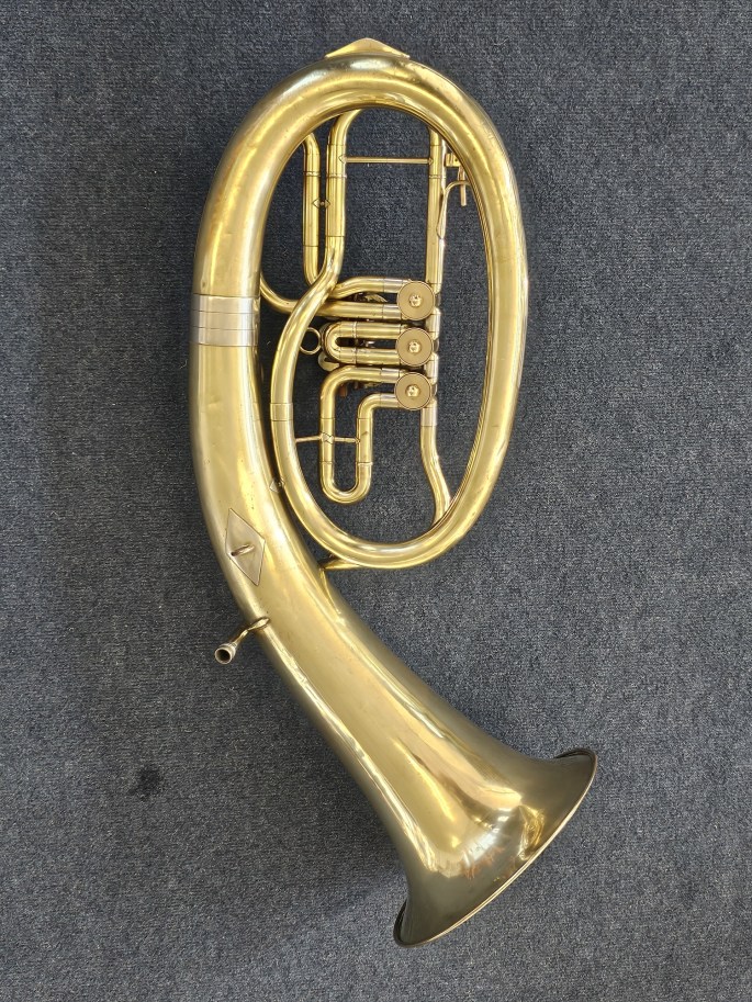 Een degelijk gebouwde Bes tenorhoorn, gestempeld Symphony B.M.C., gemaakt door Amati, een bekende Tsjechische bouwer van koperblaasinstrumenten. Het instrument is volledig nagekeken en speelklaar.